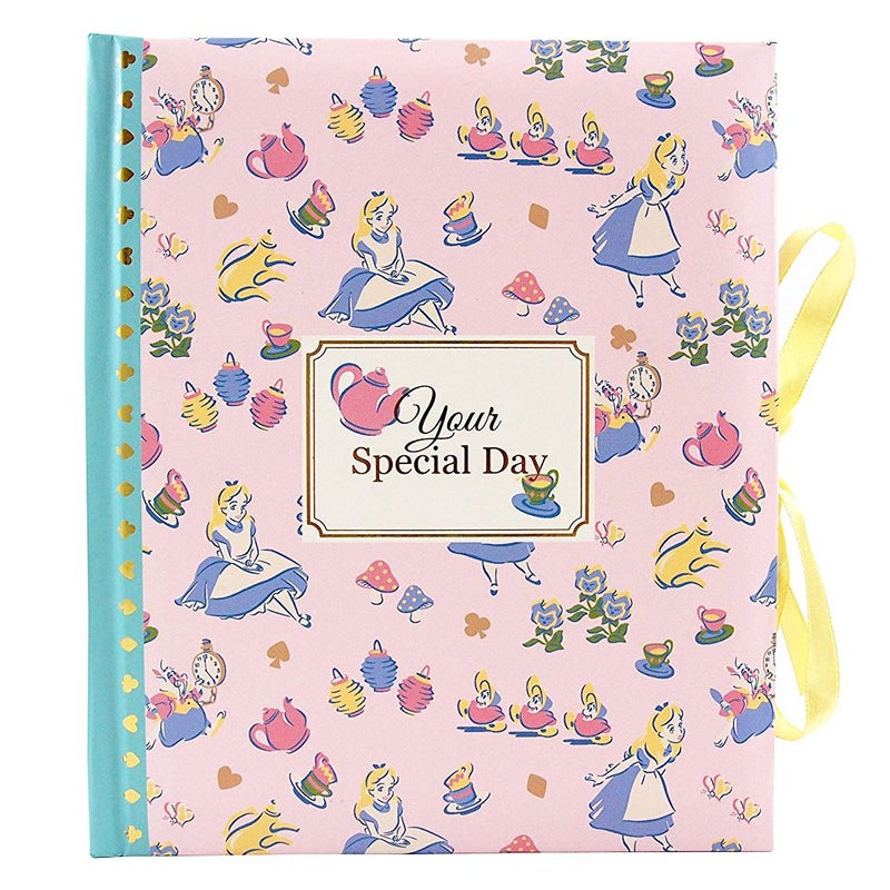 ディズニーアルバムのアリス。 リボンがついており、おしゃれなポイントにもなる上、持ち運びなどで開くのを防止するためにリボンで表紙の開閉をとめる役目もあります。 台紙にもキャラクターがそれぞれ入っており、非常にかわいいつくり。 キャラクターがないところは水玉模様です。