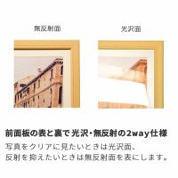 gran(グラン)は、ポスターサイズの木製額縁です。前面板に1mm厚のPET樹脂を使用しており、前面のたわみを防ぎます。また、表と裏で光沢・無反射の2WAY仕様となっており、写真をクリアに見たいときは光沢面、反射を抑えたいときは無反射面を表にするなど、状況に応じた展示が可能です。