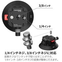 VS-118は、機密性に優れた吸盤マウントです。固定したい位置(平らな面)に吸盤を配置し、ポンプボタンを戻らなくなるまで繰り返し押すことで、内部にて真空状態を作り出し、しっかりと固定することができます。変換ネジはワンタッチで取り出すことができ、1/4インチネジ・3/8インチネジの変換が簡単に行えます。