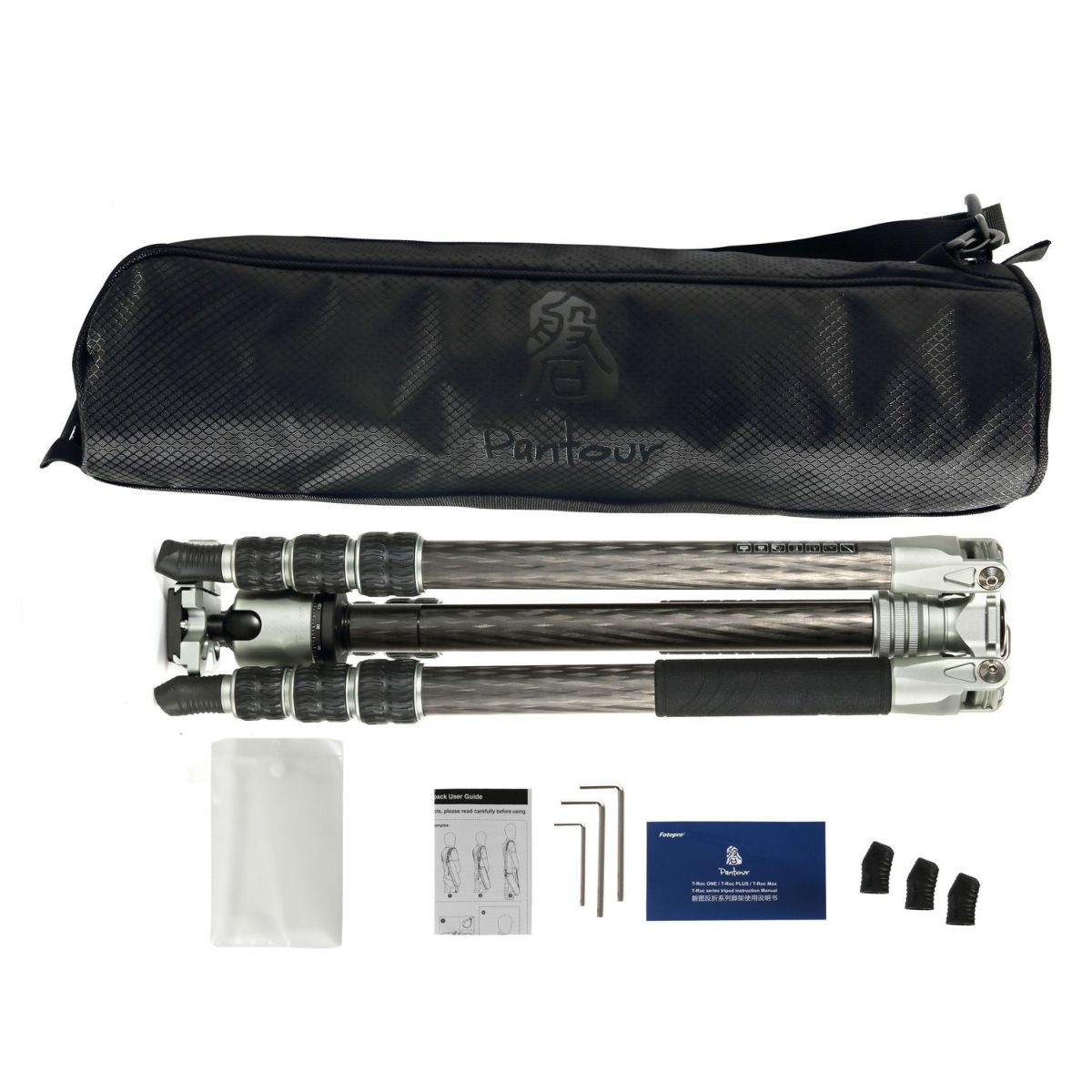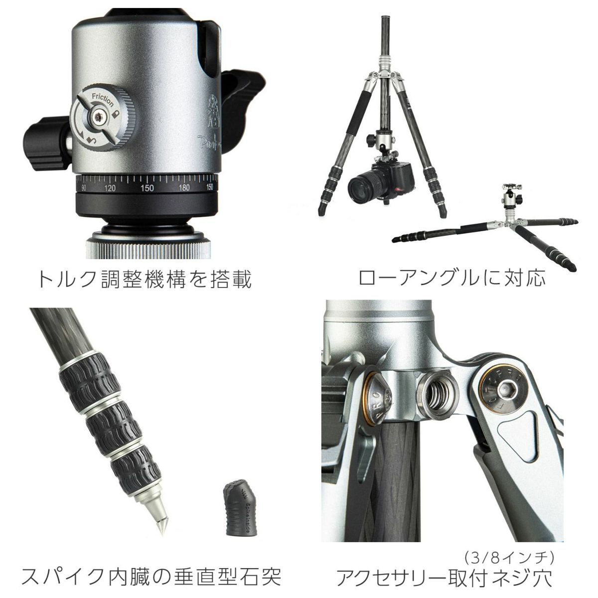 Fotopro T-ROCシリーズは剛性の高い脚、高精細な自由雲台を採用したプロフェッショナル向け中型三脚です。 脚パイプ、センターポールには”1K”8層カーボンを使用しており、一般的なカーボン素材に比べ高い剛性・軽量さ・振動吸収性に優れます。 T-ROCシリーズの自由雲台はトルク調整機構を搭載した高精細モデルを採用。グリップ力の高い垂直型石突ゴム・スパイクにより高い安定性を生み出します。