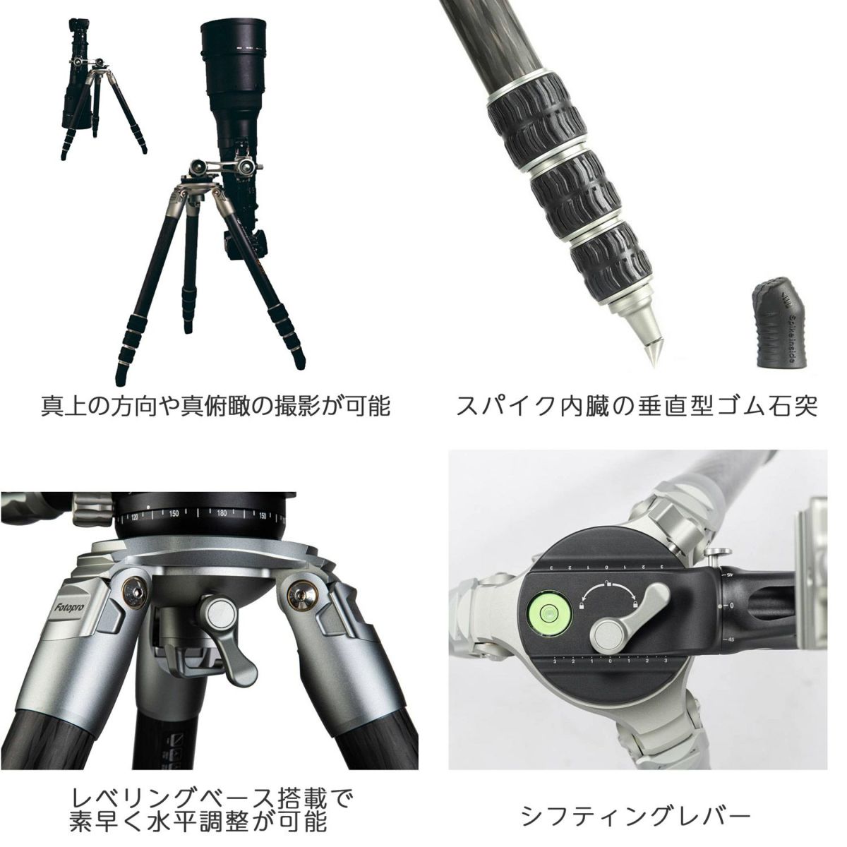 Fotopro E9 は剛性の高い脚、精細・多機能なジンバル雲台を採用したプロフェッショナル向け大型三脚です。脚パイプには8層のクロスカーボン(1Kカーボンファイバー)を使用しており、一般的なカーボン素材に比べ高い剛性・軽量さ・振動吸収性に優れます。ジンバル雲台はアルミ削り出しのスイングアームを搭載し、様々なシーンの撮影に対応します。グリップ力の高い垂直型石突ゴム・スパイクを採用し高い安定性を生み出します。