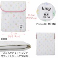 「happy osanpo camera」をモットーにオシャレで機能的なカメラグッズを販売している"ミーナ"とKingのコラボ商品です。ふわふわのクッション材がタブレットを守ります。表地のコットンはビニールコーティング加工されており、水濡れや汚れに強い仕立てです。