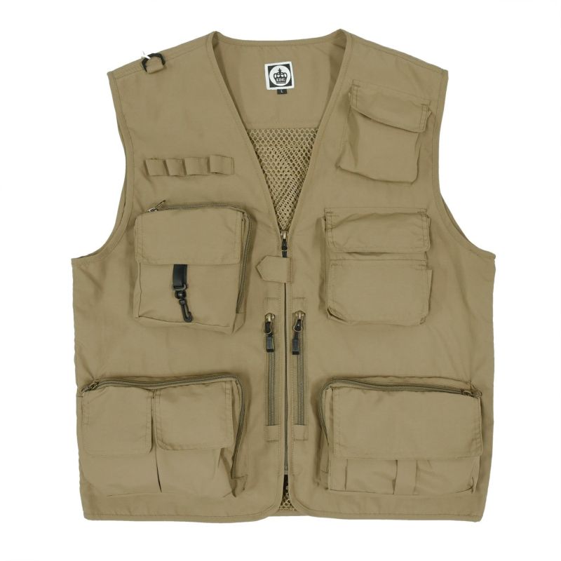 15箇所のポケットを備えており、様々なものを収納して身軽に撮影できる撮影用のベストです。生地の内側は通気性の良いメッシュ素材を使用、暑い季節は背中部の表地を取り外して収納可能な仕立てです。