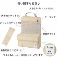「happy osanpo camera」をモットーにオシャレで機能的なカメラグッズを販売している"ミーナ"とKingのコラボ商品です。普段使いのリュックに入れることでカメラリュックとして使用することができます。背面ポケットにはタブレットやA4ノートが収納可能なほか、多機能ポケットや鍵用フックなど便利な収納を備えています。