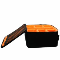 King K-CLC39は、カメラ・レンズの収納・運搬に便利なケースです。ほどよいクッション性で機材をしっかり保護します。フルオープンタイプで収納物の確認、出し入れが簡単。内装色は暗所での視認性を高めるオレンジ色を採用、天面内側に小物類が収納できるメッシュポケットを配置。中仕切りは機材に合わせて位置調整や着脱が可能、縦横の寸法は一般的なカラーボックスにぴったり収納できるサイズです。