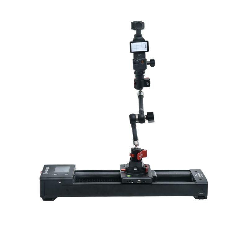 カメラやスマートフォンを取り付けて、水平移動と360°パンの動きを取り入れた映像を撮影できます