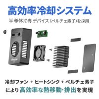 半導体冷却デバイス(ペルチェ素子)・ヒートシンクを利用した冷却システムを採用。