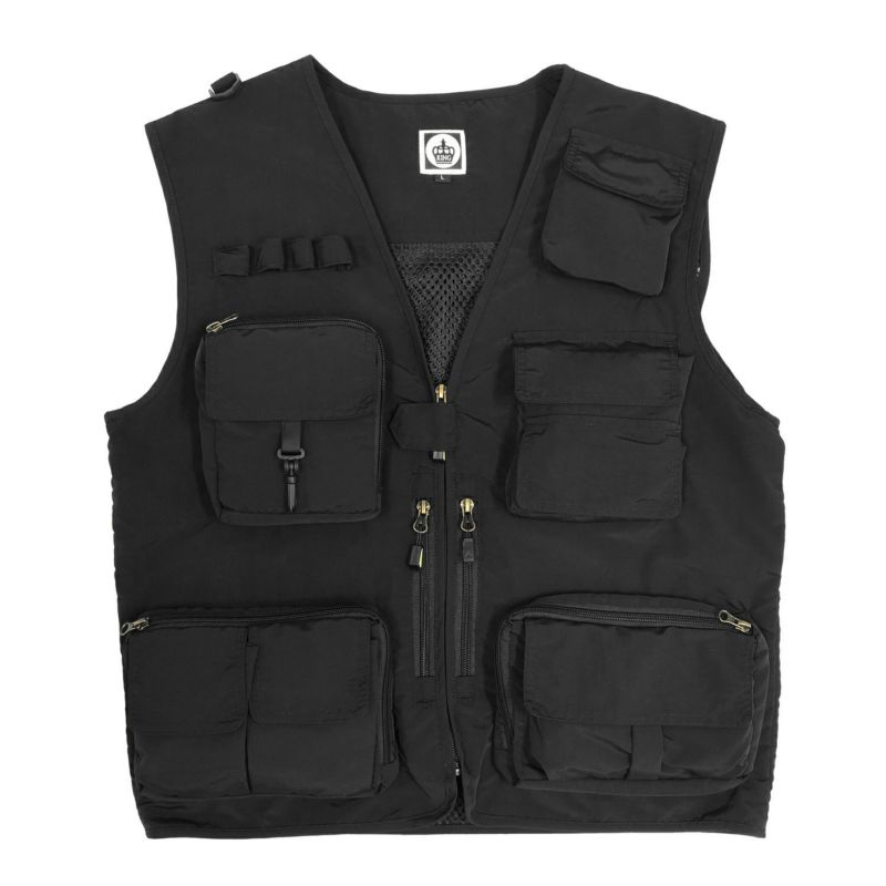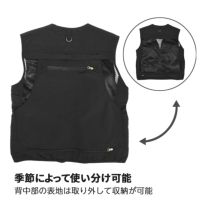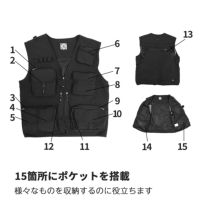 15箇所のポケットを備えており、様々なものを収納して身軽に撮影できる撮影用のベストです。生地の内側は通気性の良いメッシュ素材を使用、暑い季節は背中部の表地を取り外して収納可能な仕立てです。