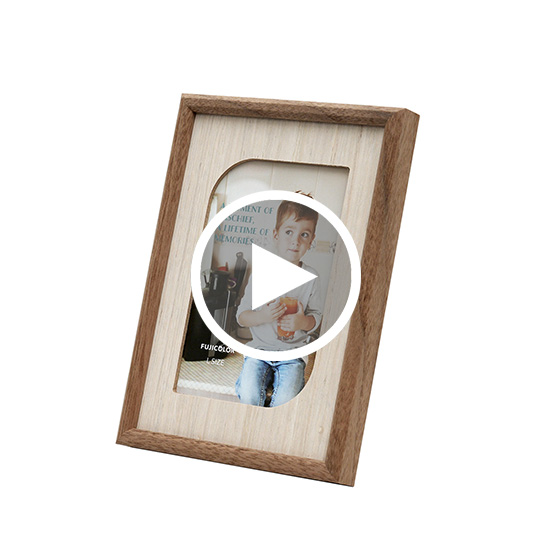FUJICOLOR ウッディフレームMellowは、温かみのある木製マットを採用、四角や楕円ではない、遊び心溢れる窓枠デザインが印象的な木製フレームです。吊金具付きで壁掛けにも対応