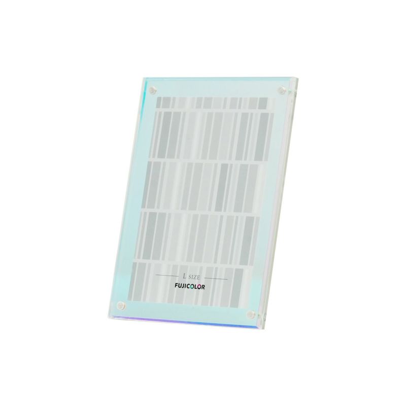 FUJICOLOR アクリルフレーム レインボーは、見る角度によって色が変わる『レインボー』カラーのアクリルフレームです。プリントは、2枚のアクリル板で挟み、マグネットで簡単に固定できます。