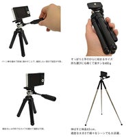 超小型ながら10段タボ式で最大伸長63cm。ハンドルの付きの雲台は固定も解除もハンドルを回すだけの簡単操作。