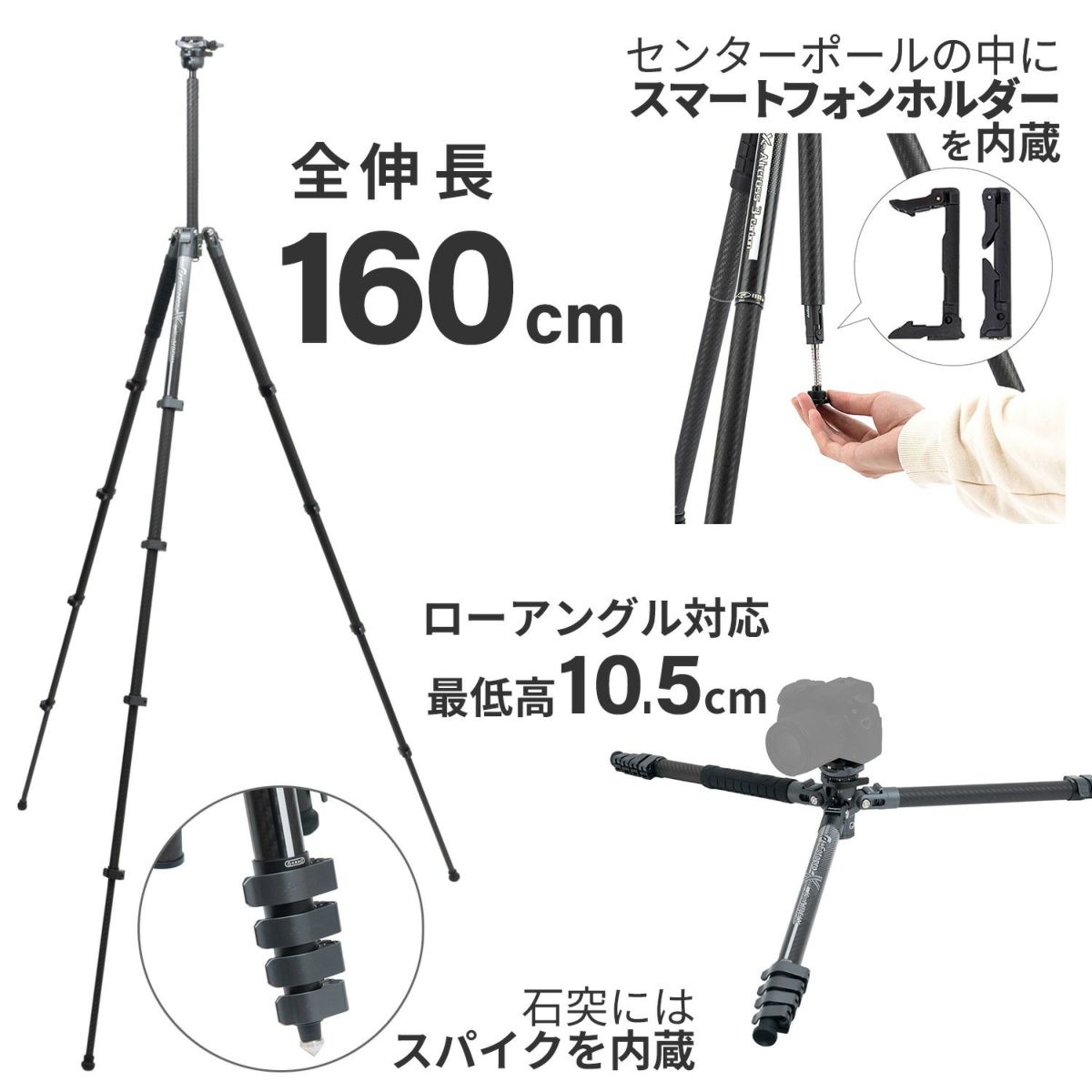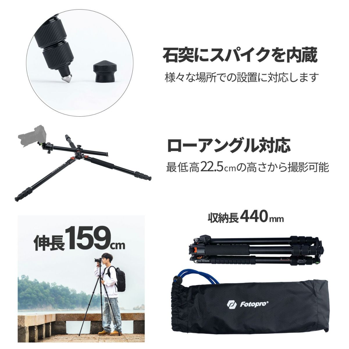 他の画像を見る Fotopro X-go E カーボン三脚 カーボン 5段 多機能なカーボン三脚 伸長152cm / 縮長36cm / 質量980g 販売価格 ¥ 24,200 税込 カートに入れる お気に入りに登録する