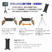 「ID-200+」は、タブレット端末で三脚を使った写真・動画撮影を可能にする、タブレットホルダーです。 シンプルな設計、スプリング式で簡単に取付けができます。挟み込むことで 簡単かつ本格的な写真・動画撮影が可能です。 動画鑑賞や料理中のレシピ確認等にもおすすめです。17cm~24cm以内のタブレットに対応可能。