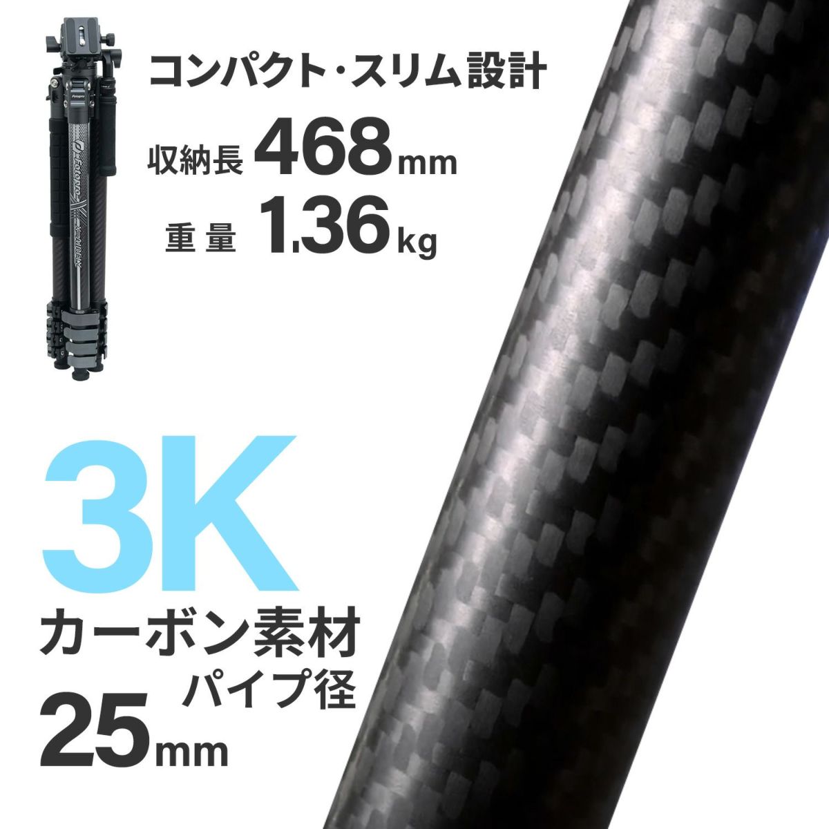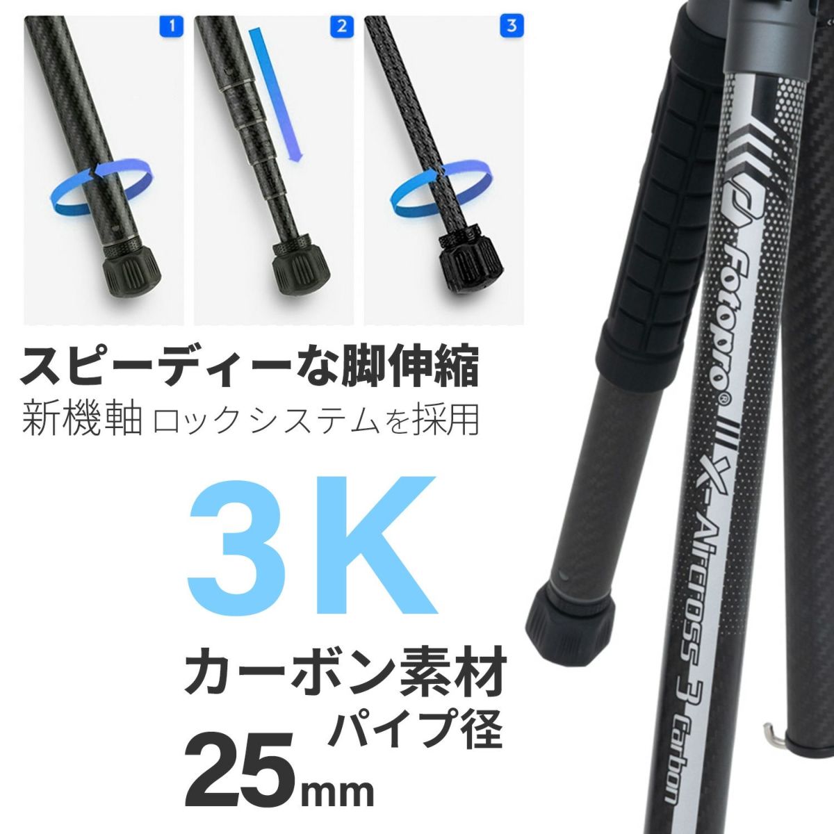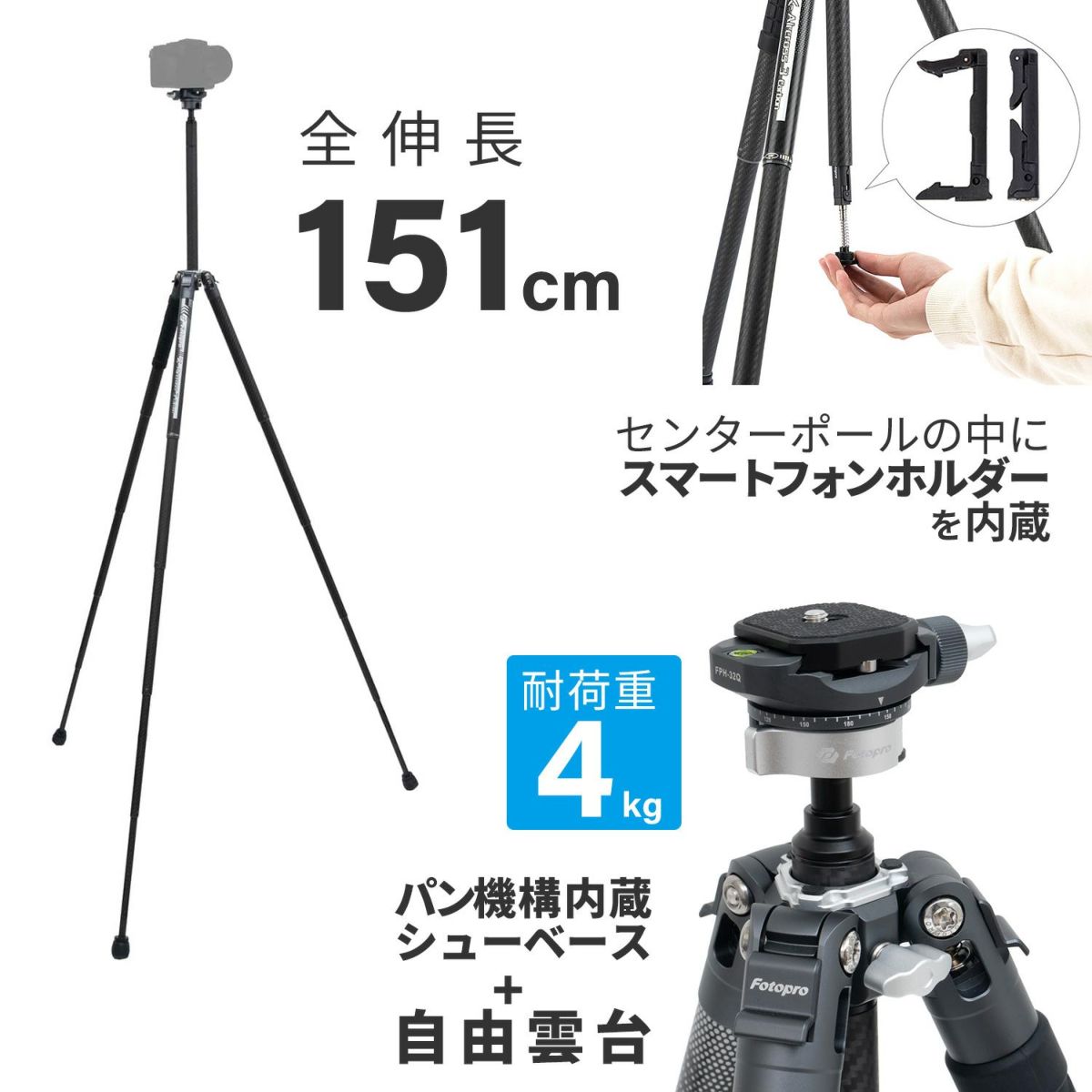 他の画像を見る スマホ カーボン 4段 Fotopro X-AIRFLY Max カーボン三脚 販売価格 ¥ 51,700 税込 ボールヘッドと水平パン搭載のカーボン三脚 伸長166cm / 縮長50.5cm / 質量1360g カートに入れる お気に入りに登録する