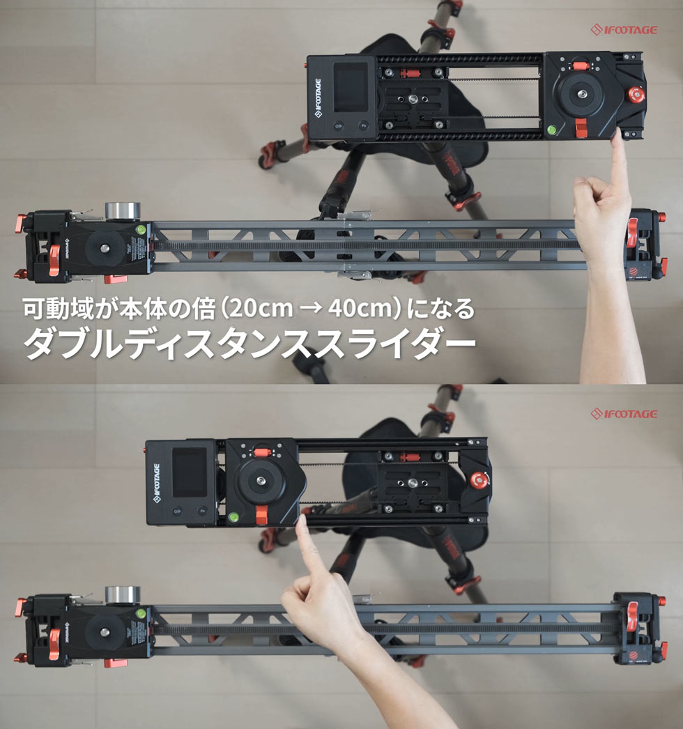 こういう風に別々に表と裏で動くことによって、ここに3脚を取り付けるんですけども、3脚を取り付ける時2倍の長さ40センチの可動域が生まれるというものが、このダブル・ディスタンス・スライダーになっています。