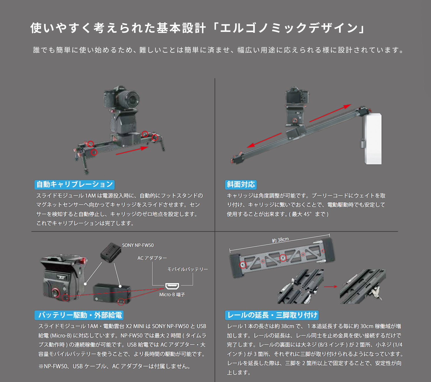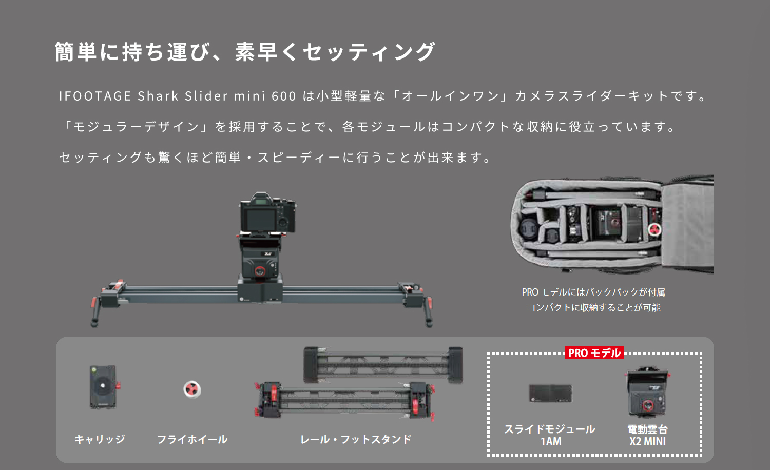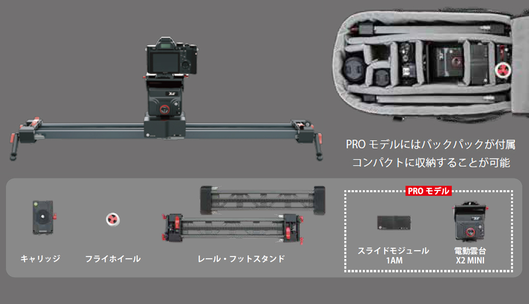 電動雲台とスライドモジュール、バックパックが付属するPROセット