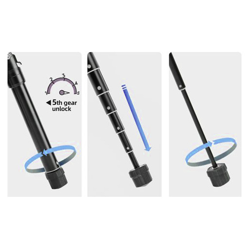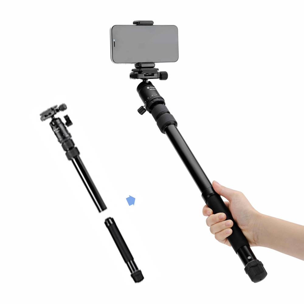 Fotopro FY-830は、コンパクトながら様々な機能を備えた三脚です。脚をかんたんに取り外すことができ、分解してコンパクトに持ち運べます。脚部伸縮はインナーロック方式を採用し瞬時に展開可能、取り外した脚をセンターポールと組み合わせて一脚や自撮り棒としても使用できます。