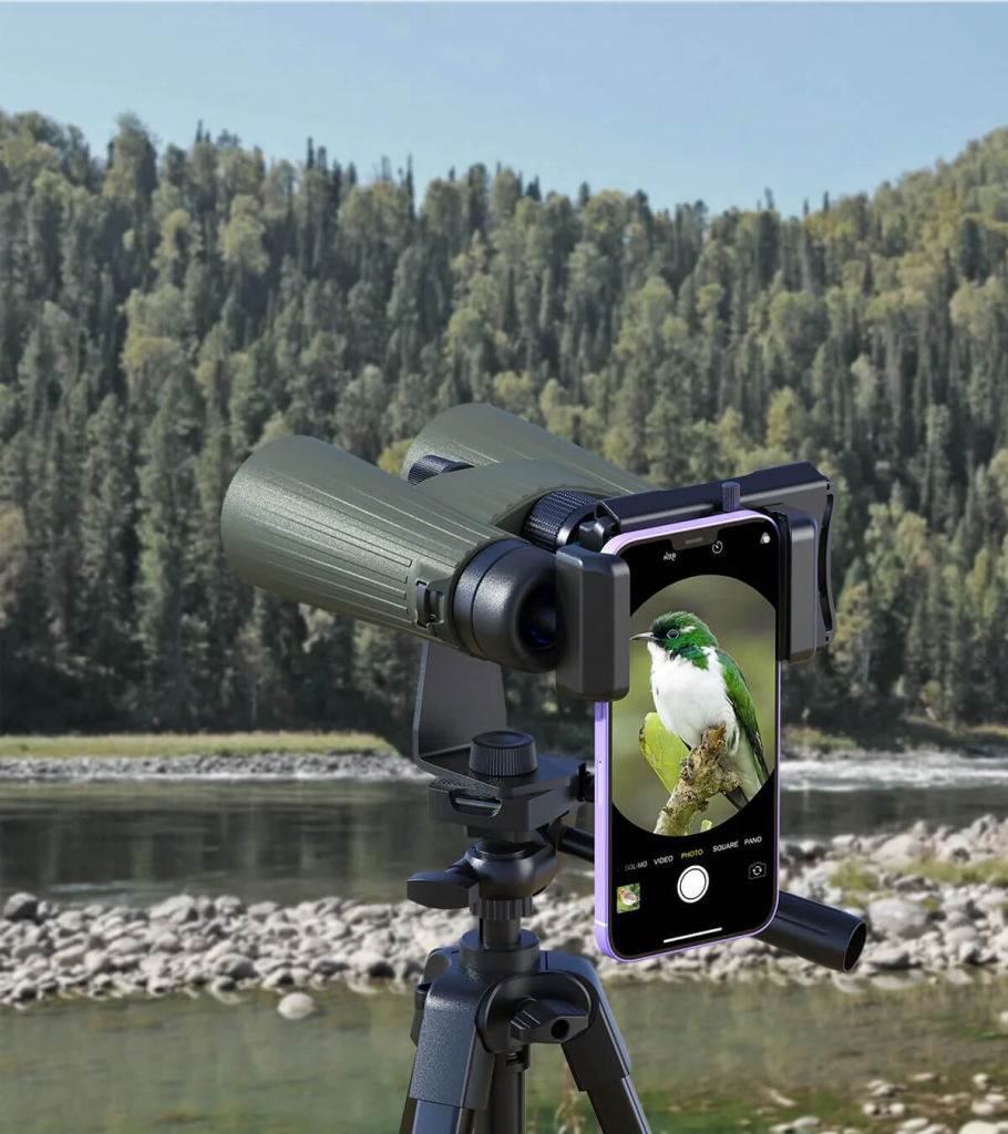 双眼鏡や望遠鏡にスマートフォンを取り付けて撮影可能