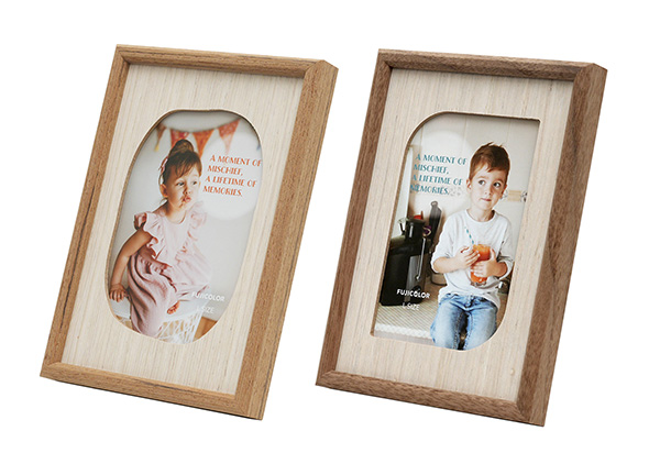 FUJICOLOR ウッディフレームMellowは、温かみのある木製マットを採用、四角や楕円ではない、遊び心溢れる窓枠デザインが印象的な木製フレームです。吊金具付きで壁掛けにも対応