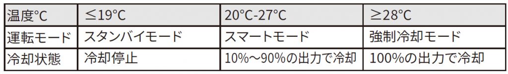 冷却面の温度を20-27℃の間に自動で制御します。過冷却による結露を防止するため19℃以下になるとファンを停止し冷却を一時中断、 再び20℃以上になると冷却を再開します